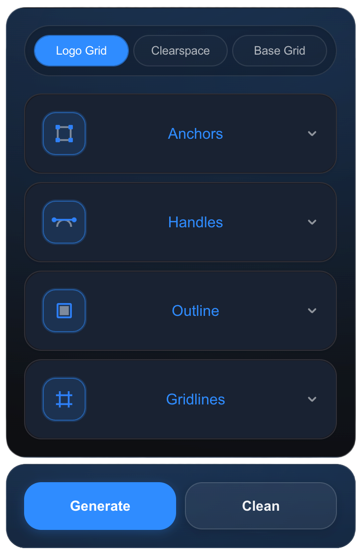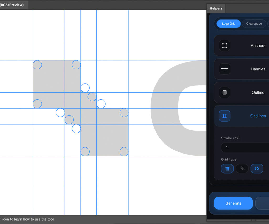 Extract anchor points from path geometry (adjustable size & shape, square or circle) Visualize bezier control handles independently from anchors Generate alignment lines from horizontal, vertical, and diagonal segments Detect circular arcs and reconstruct them as circle-based grids Create bounding box outlines for logo lockups.